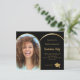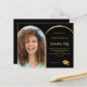 Add your own vertical size photo of the graduate. A faux gold arch shaped photo frame. A classic black background colour. Personalise and add a name and party details.