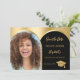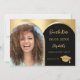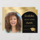 On front: Add your own vertical size photo of the graduate. Faux gold photo arch frame. A golden and black background, golden text. Templates for a name and date. The name and the text: Save the Date are written with a modern hand lettered style script. With a cap, tassel topper.
