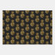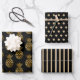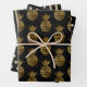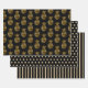 Three sheet wrapping paper in coordinating black and gold. Sheet 1 is black with gold pineapples, sheet 2 is a gold polka dot pattern on black, and sheet 3 is a gold striped pattern on black. Contact us for help with customisation or to request matching or coordinating products.