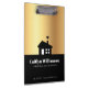 This custom, promotional real estate company clipboard is a terrifically stylish way to showcase yourself to your clients. A simple, black graphic modern house icon and bold white typography on a black band overlay a faux gold foil background. Personalise with your name and company plus phone number, website or other copy. The 9”x12.5” size holds up to .5” of paper securely. Makes a chic, professional and elegant statement as an unique leave-behind promotion for your clients.