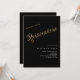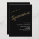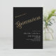 A modern minimalist Quinceañera invitation. Classic black background and the word Quinceanera written with large letters in faux gold. Personalise and add a name and party details.