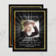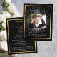 An elegant 2-page program. A classic black background, a faux gold frame, and space for a photo. Light beams behind the photo. Personalise and add name, dates and your text.