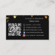 Classic black background colour. Decorated with faux gold stars. White text and icons. Personalise and add your business logo, name, title and contact information. Add your website url/link to the Qr code. With Facebook and Instagram icons.