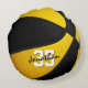 This sporty team colours basketball themed pillow for him or her features the realistic image of a basketball that has alternating black and gold recolored panels - personalise with player name in an "autograph" style font overlying the athlete's jersey number - by katz_d_zynes