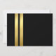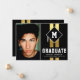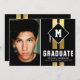 Modern guy graduation announcement card featuring 2 faux gold foil stripes on a trendy black background, a photo of the child, a motarboard with the graduates initial on top, and a announcement template that is easy to personalise.