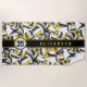 This volleyballs pattern beach towel features a random pattern of varied size black, gold and white stylised volleyballs turned every which way on a customisable white background - personalise with her name and jersey number - by katz_d_zynes