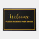Elegant black and gold door mat with nice typography saying Welcome please remove your shoes. The door mat can be customised to your specific needs. Welcome all guests to your home with this beautiful mat.
