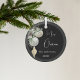An elegant, modern black background. Decorated with white and gold baubles and some greenery and a pine cone. Personalise and add your name, year. Text: Merry Christmas