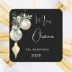 For a Christmas party favours or gift wrapping. An elegant, modern black background. Decorated with white and gold baubles and some greenery and a pine cone. Personalise and add your name, year. Text: Merry Christmas