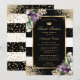 Elegant black and gold floral sweet sixteen birthday invitation featuring a gold frame adorned with purple and white orchids and gold glitter.