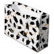 For the graduate, this gift bag has a pattern of black graduation hats with gold tassels on a white background. Both sides of the bag have the same image.
