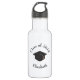 Personalised water bottle designed with a black graduation cap surrounded by a semi-transparent white circle. Class of 20xx and a name written in curved text. Modern and stylish.