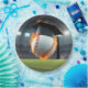 A baseball engulfed in flames is topped with a graduation cap, floating in a stadium with vibrant lighting.