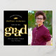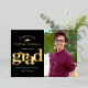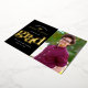 Announce to the world that your favourite grad has reached their milestone with this stunning, simple, modern, personalised announcement. Bold, stark, graphic, real gold foil grad typography and cap icon overlay a black background. On the right hand side, add a photo of your choice. Personalise the custom text with your graduate’s name, school name, and class year. On the back, under the bold “congrats” graphic, add your personal note, next school they’re attending, party information, etc. Matching and coordinating thank you cards, cap toppers, fans, napkins, plates, banners and other graduation goodies are also available in this trendy and stylish collection. Guaranteed to add stylish fun to their special occasion!