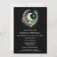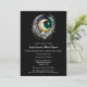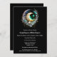 A plain, simple yet elegant mystical design featuring a faux gold ornate crescent moon framed by grey clouds in a midnight black sky which has small emerald green stars that appear to shimmer, shine and glow. Pale grey editable text templates appear below the graphic and the background colour may be changed to any or your personal choice. This chic AI graphic is ideal for moon and star, celestial, starry night and mythical or fantasy weddings, birhdays and special events.