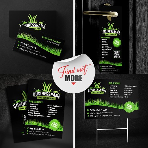 This sleek and professional business card design is perfect for any lawn care or landscaping business. The black background provides a striking contrast to the vibrant green grass and lawnmower icons, creating a memorable visual impact.