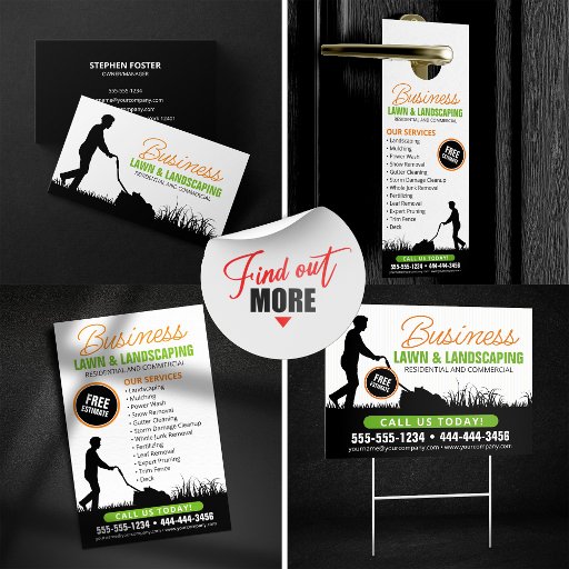 This minimalist and professional business card design is perfect for showcasing your lawn care and landscaping expertise. The bold silhouette of a person mowing a lawn communicates your services instantly while the clean black background emphasizes your contact information.