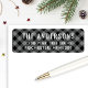 Holiday return address labels feature white modern custom text that can be personalised. Grey and black buffalo check / plaid patterned background included.
