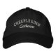 Black cotton ball cap, with grey embroidered text reading CHEERLEADER, in a slight arch shape. Additional grey embroidered text, under Cheerleader text, is ready to personalise. Great for cheerleaders and cheer coaches.