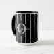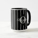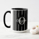 Grey stripes all over this coffee mug over Black with an interior and handle in Black. A monogram sits in the centre for you to personalise. Shown here is a sample monogram of a "O" and a breezy text reading "Oregon" across the O. Grab some for your next Sunday in the cave.
