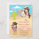 This cute and fun invitation features a cowgirl with black hair and fair skin. In one pose she is riding a horse and throwing a lasso and in the other she has a coil of rope and is waving. In the background is a western scene with sand, mountains and a cactus. The text combines decorative and sans serif fonts for a stylish and modern look. This is perfect for a cowgirl or western themed birthday party.