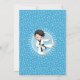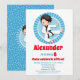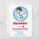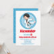 This boy's birthday invitation features a cute dark haired martial arts kid with black belt. On blue decorative background.
