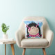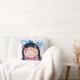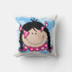A black haired girl with braids and a pink flowered collar and pink bows in her hair on a blue background pillow.