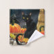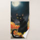 A black cat sits in a doorway with pumpkins, lantern, broomstick, autumn leaves and a full harvest moon in behind.