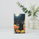 A black cat sits in a doorway with pumpkins, lantern, broomstick, autumn leaves and a full harvest moon in behind