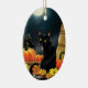 A black cat sits in a doorway with pumpkins, lantern, broomstick, autumn leaves and a full harvest moon in behind.