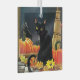 A black cat sits in a doorway with pumpkin, lantern, broomstick, autumn leaves and a full harvest moon in behind.