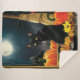 A black cat sits in a doorway with pumpkins, lantern, broomstick, autumn leaves and a full harvest moon in behind.