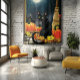 A black cat sits in a doorway with pumpkins, lantern, broomstick, autumn leaves and a full harvest moon in behind.