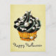 Cute Halloween design - cupcake with black cream and lots of tiny skulls and bones in it. To addition, small skull pin attached to the ribbon. Definitely nice Halloween dessert for any party of 'trick or treat'.
