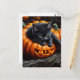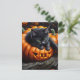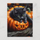 An adorable black Halloween kitten with funky AI generated art quirks of the jack-o-lantern face not being perfect.