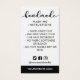 Washing instructions insert card for your small business of handmade goods. Handmade written in black calligraphy at the top. Add washing instructions in black. Beneath black social media icons, your social media handle. And your website at the bottom.