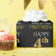 This wrapping paper design features a message like "HAPPY 4th BIRTHDAY", with the "4th" having a faux/imitation gold appearance. It also features a name that can be customised, and a black coloured background. It could perhaps be used when wrapping gifts being given for somebody’s fourth birthday. [~Z0000130]