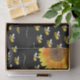 Decorated with happy, smiling yellow and black bumble bees and a large watercolored sunflower. A chic black background. Personalise and add a name. The name is written with a modern hand lettered stylie script with swashes. To keep the swashes only delete the sample name, leave the spaces or emoji's in front and after the name.