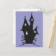 Crooked creepy haunted house in a black silhouette on a purple background.