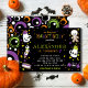 Celebrate your scary birthday with this black and orange haunting Halloween birthday invitation. This design features a variety of Halloween characters, colourful dots, stars, and moons on a black background on the front, and colourful eyes on the reverse side.