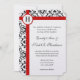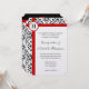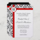 The elegant black and white design is accentuated by a red trim and a beautiful damask pattern. The heart pattern adds a personal touch that will add a romantic feel to the design. The top corner placement of the monogram creates a unique and sophisticated look that sets these invitations apart.