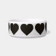 This pet feeding bowl features a repeating pattern of shapely black hearts.