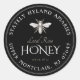 Personalise with your apiary name and address, honey net weight and any honey descriptors (pure, raw, clover, etc.). Vintage bee design in centre. White text and illustration on a black background. Common honey net weight conversions: 8oz (227g), 12oz (340g), 16oz (454g), 32oz (907g), 5lb (2.27kg).