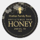 Stylish label with yellow text on a black label with chiseled honeycomb and dashed border.