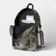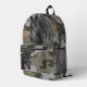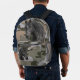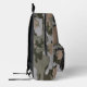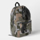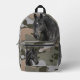 Backpack with camouflage pattern and black horses design. Colours are army green, dark forest green, light grey, and tan. Include a name, in tan, on the zipper pocket, or delete the sample text. Unisex design for boys or girls.