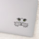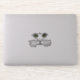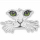 This vinyl sticker has a black illustration of a cat face with long whiskers and bright green eyes.