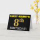 This birthday greeting card design features a message like "FIRST-NAME’S 8th BIRTHDAY!", with the "8th" having a faux/imitation gold-like colour appearance. The recipient’s name on the front can be customised, and the front background is coloured black. It also features a customisable birthday greeting message on the inside. A birthday greeting card like this could perhaps be given to somebody in celebration of their eighth birthday. [~Z0000183]