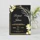 A black and white wedding invitation with blue and white flowers on a black background. The invitation features the names of the bride and groom, Richard and Juliana, along with the date, time, and location of the wedding.