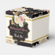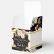 This chic and modern favour box features a colourful floral pattern with a black background and an ivory and simulated gold band around the centre with a black and gold-edged bracket-shaped text area on the front and back sides. There is also a larger bouquet with lovely roses in cream, ivory, and pink, with an orange Peruvian lily and green foliage on the front and back above the customisable text. Under the bouquet, custom text says, "Melissa's Bridal Shower" in coral pink with the date of the event in sage green below and the words, "Thank You!" in ivory at the bottom. Email niteowlstudio@gmail.com if you need any matching items or need help customising the wording.