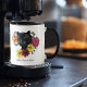 A powerful black jaguar tattoo-style portrait. Surrounding the jaguar’s face are vibrant, colourful Mexican flowers in reds, fuchsia and yellows. Behind the Jaguar is a traditional Mexican tile in a backdrop of teal.